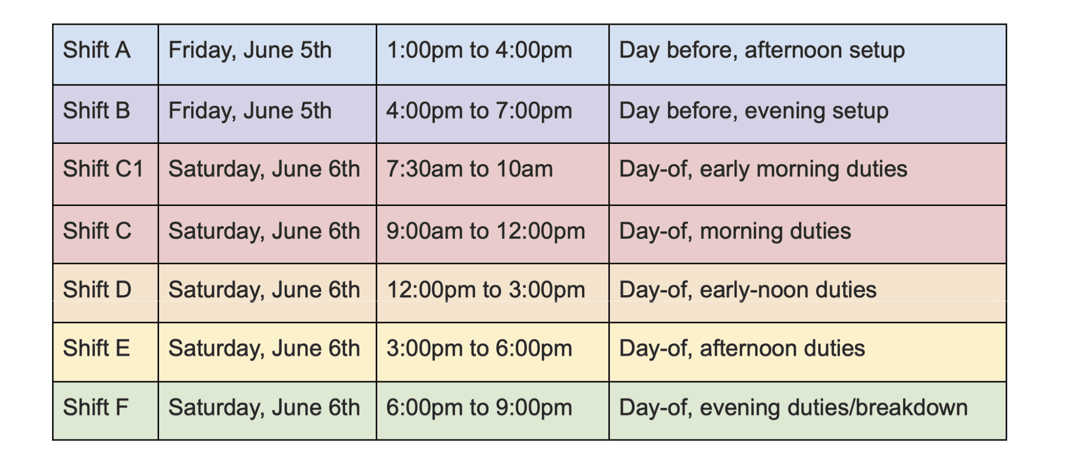 Shift(s) sign-up is available following registration. Unfortunately, due to the nature of the volunteer roles, no partial shifts will be permitted. The shift letter designations, color codes, and time slots are as follow: